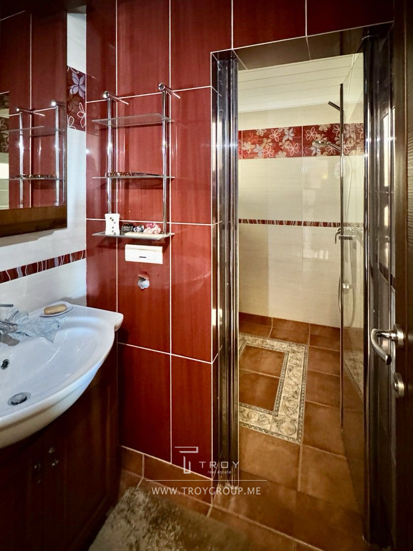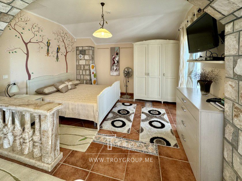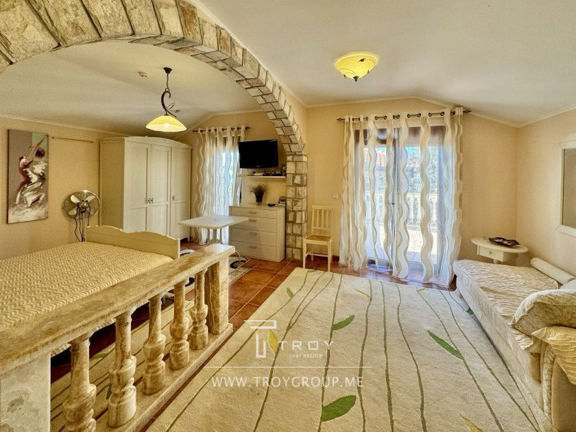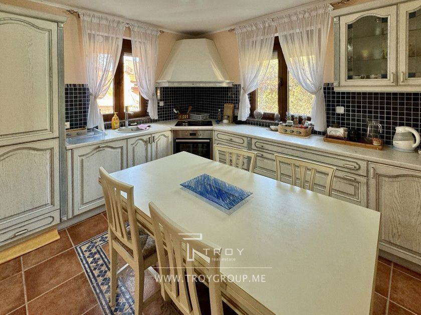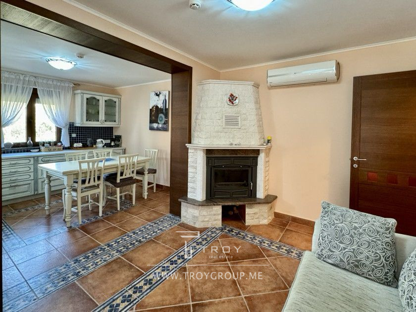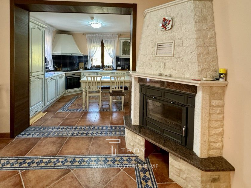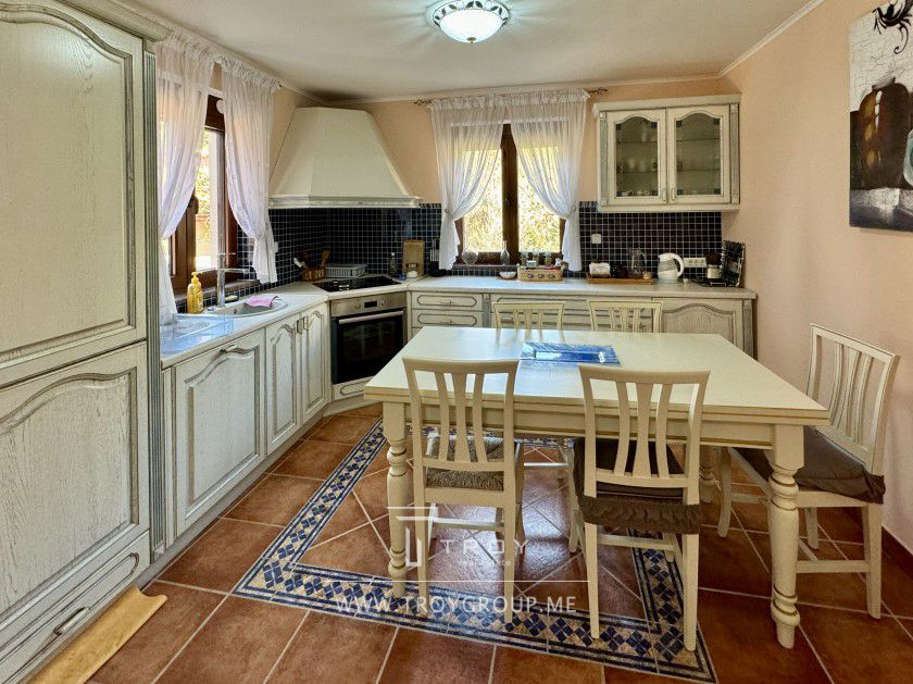 2 этаж: кухня, большая гостиная с камином, комната с ТВ и кондиционером, просторная терраса с частичным видом на море, спальня, ванная комната, коридор, кладовая. Кухня полностью оборудована качественной мебелью и техникой: холодильник, плита (электричество + газ), посудомоечная машина, вытяжка, духовка.