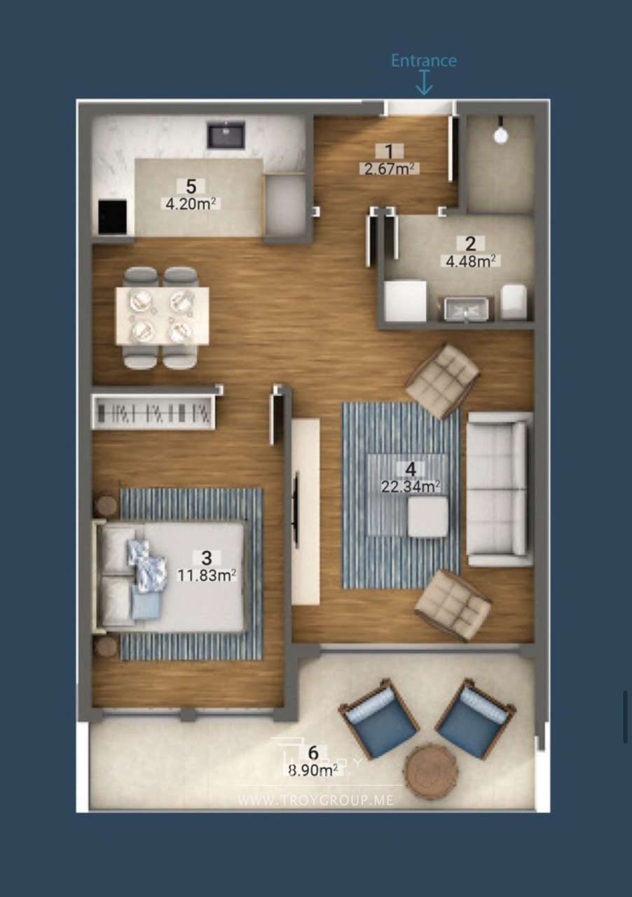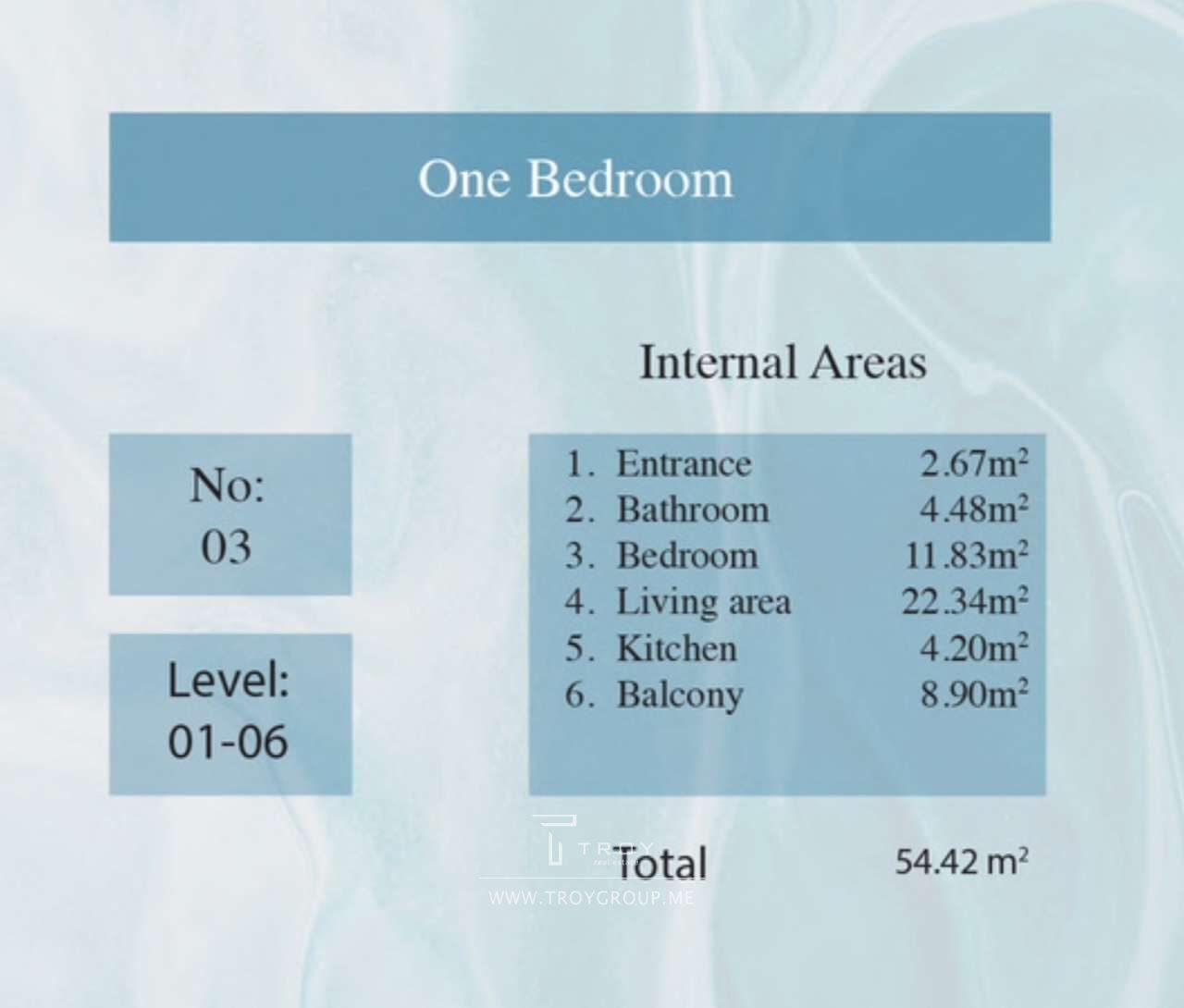 Квартиры с 1 спальней — от 45 м² до 57 м²