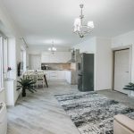 Квартира с одной спальней, гостиной открытой планировки с кухней, ванной комнатой и террасой.
